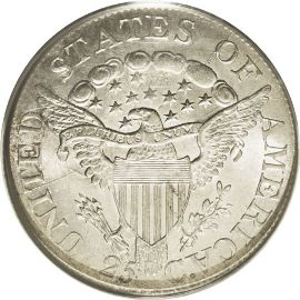 The obverse of this coin is nearly identical to that of its earlier counterpart in 1796. It features a draped bust design of Mrs. William Bingham a Philadelphia socialite sketched by Gilbert Stuart. The major difference between the two is that the second later issue only shows 13 six pointed stars around the portrait while the 1796 issue has