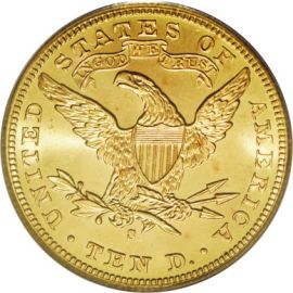 Liberty Head Eagles with motto make up the second variety within this series. These gold coins were produced at the US Mint from 1866 to 1907 and designed by Christian Gobrecht. The obverse of this coin shows Gobrecht's rendition of the American icon surrounded by thirteen stars representing the 13 original colonies. The date also appears at the base of the obverse design.