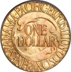 The reverse has two dolphins symbolizing the meeting of the two oceans. Inscriptions on the reverse include “PANAMA PACIFIC EXPOSITION”, “SAN FRANCISCO” and the denomination “ONE DOLLAR”.